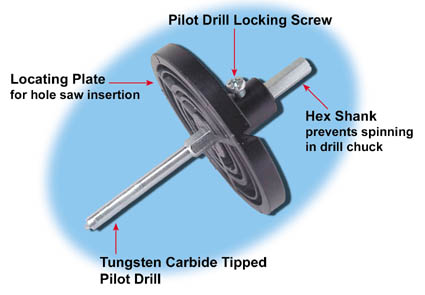 • Carbide tipped pilot drill with hex shank for precise hole positioning.