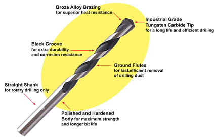 • This drill bit is machined from high carbon steel with carbide tipped cutting edges.